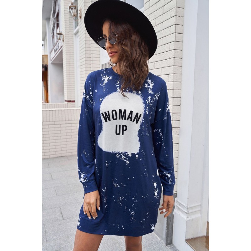 Blue WOMAN UP Bleached Tie-dye Long Sleeve Dress