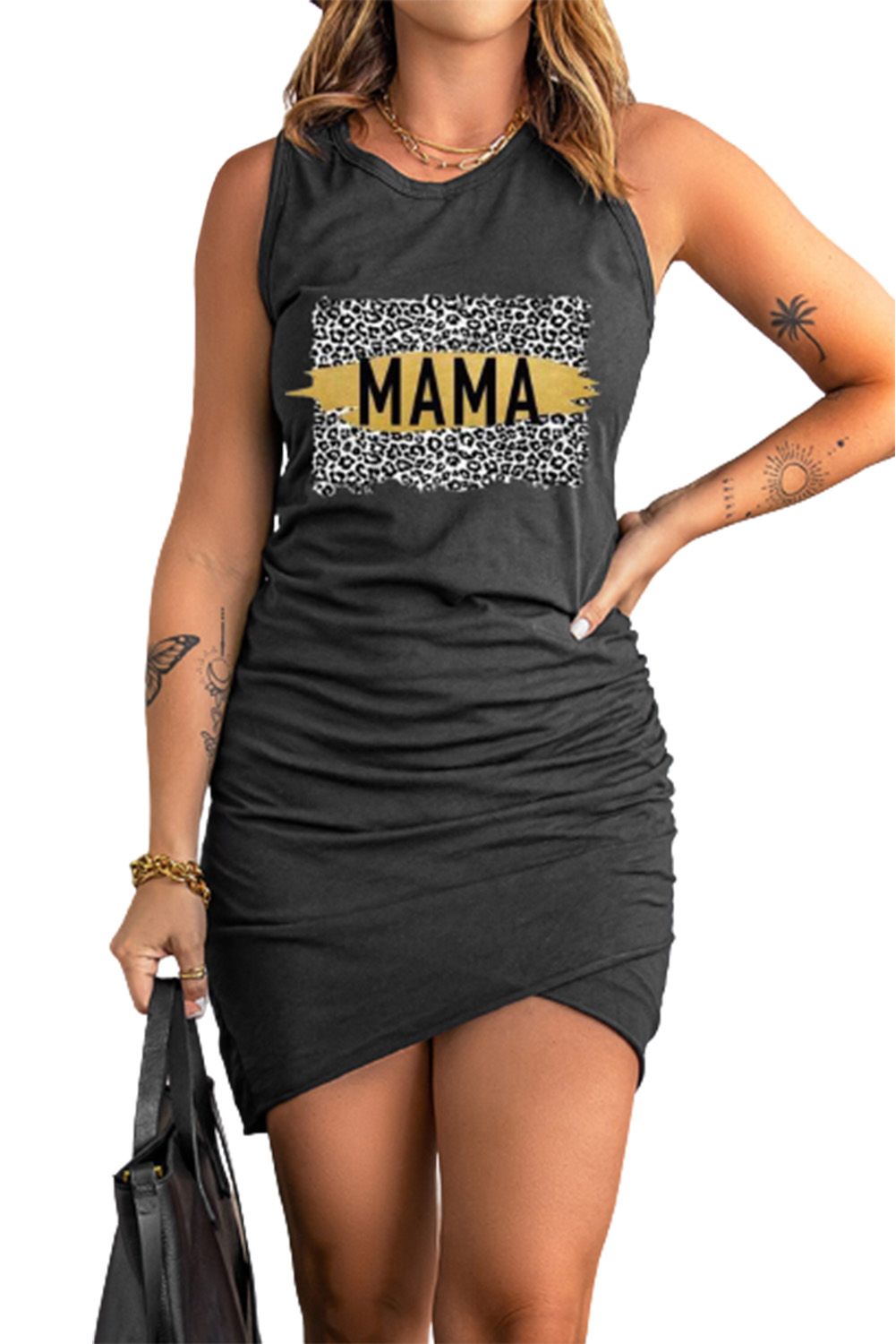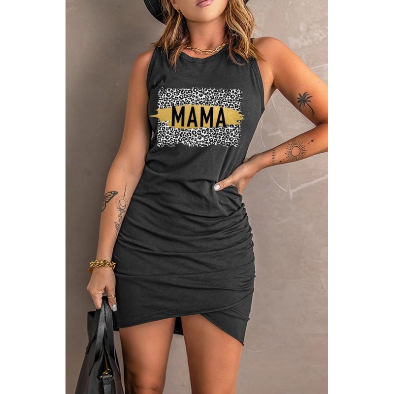 Black Leopard MAMA Graphic Ruched Arch Hem Tank Mini Dress