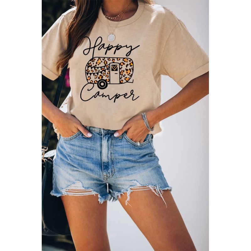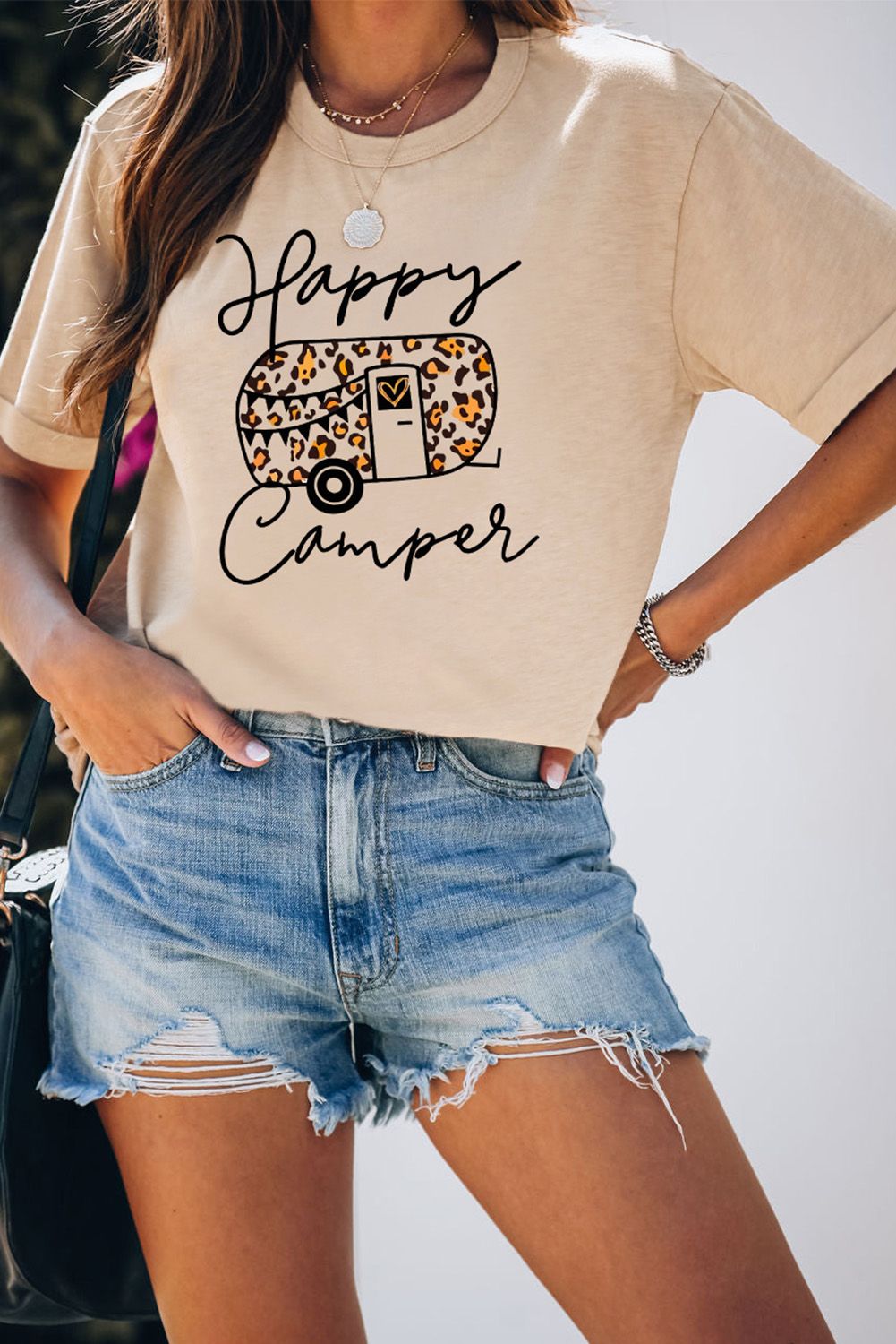 Khaki Happy Camper Letter Pattern Print Short Sleeve T-shirt