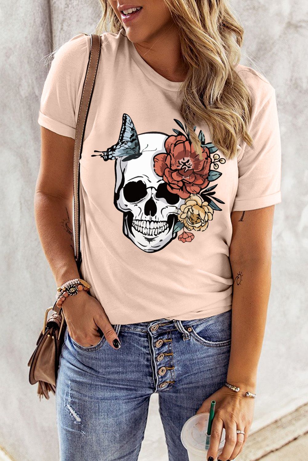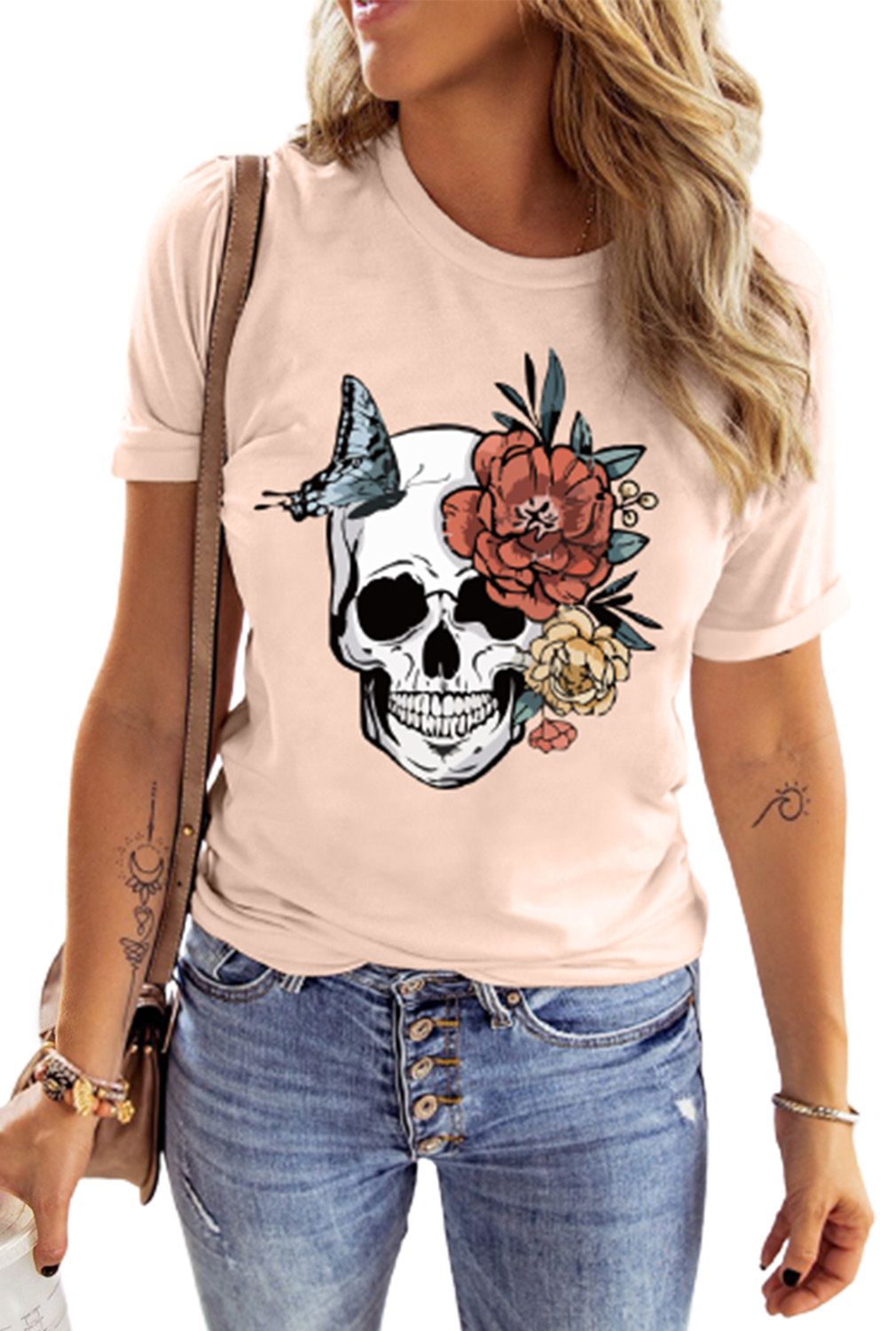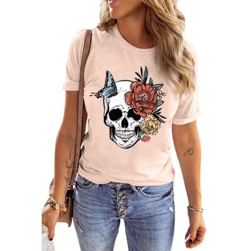 Pink Skull Floral Butterfly Printed Short Sleeve T Shirt