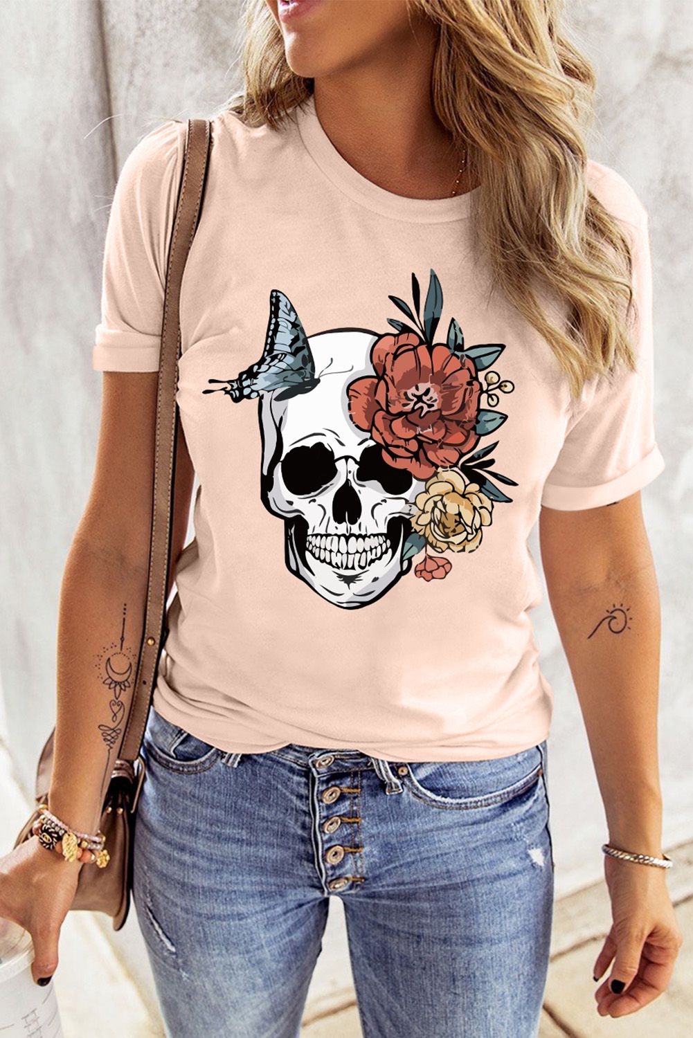 Skull Floral Butterfly Printed Short Sleeve T Shirt