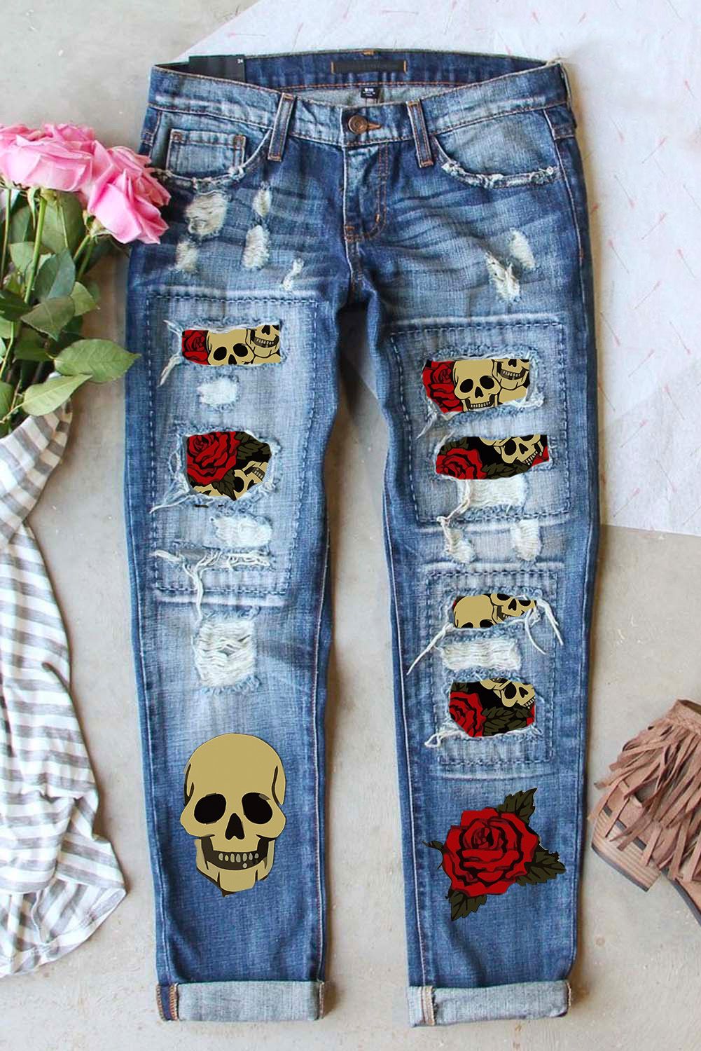 Rose Skull Patchwork Ripped Jeans